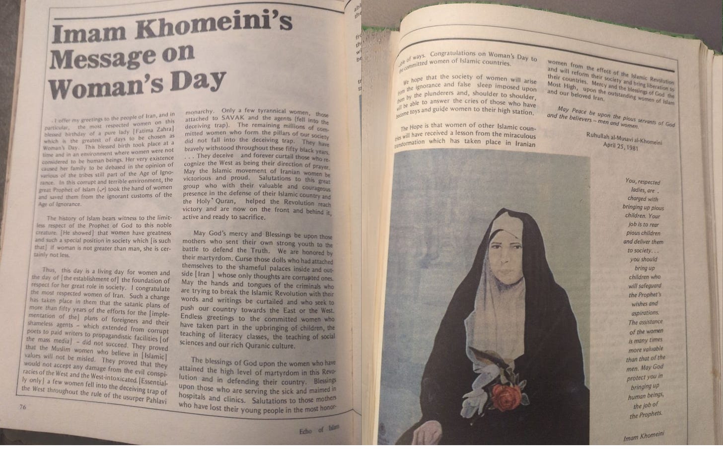 Thus, this day is a living day for women and the day of] the establishment of the foundation of respect for her great role in society. I congratulate the most respected women of Iran. Such a change has taken place in them that the satanic plans of more than fifty years of the efforts for the implementation of the plans of foreigners and their shameless agents — which extended from corrupt poets to paid writers to propagandistic facilities [of the mass media] did not succeed. They proved that the Muslim women who believe in [Islamic] values will not be misled. They proved that they would not accept any damage from the evil conspiracies of the West and the West-intoxicated. [Essentially only] a few women fell into the deceiving trap of West throughout the rule of the usurper Pahlavi monarchy. Only a few tyrannical women, those attached to SAVAK and the agents [fell into the deceiving trap]. The remaining millions of committed women who form the pillars of our society did not fall into the deceiving trap. They have bravely withstood throughout these fifty black years. . . They deceive and forever curtail those who recognize the West as being their direction of prayer. May the Islamic movement of Iranian women be victorious and proud. Salutations to this great group who with their valuable and courageous presence in the defense of their Islamic country read the Holy’ Quran, helped the Revolution in victory and are now on the front and behind it, active and ready to sacrifice.