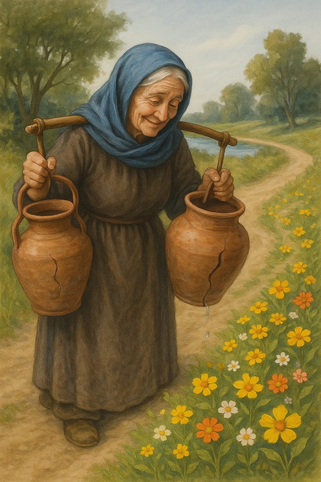 Long ago, in a quiet village nestled between the hills and a flowing river, lived an old woman known for her kindness and gentle spirit. Every morning, she walked to the river carrying a wooden yoke across her shoulders, from which two clay pots hung. One pot was flawless, always delivering a full portion of water. The other was cracked, slowly leaking drops with every step.