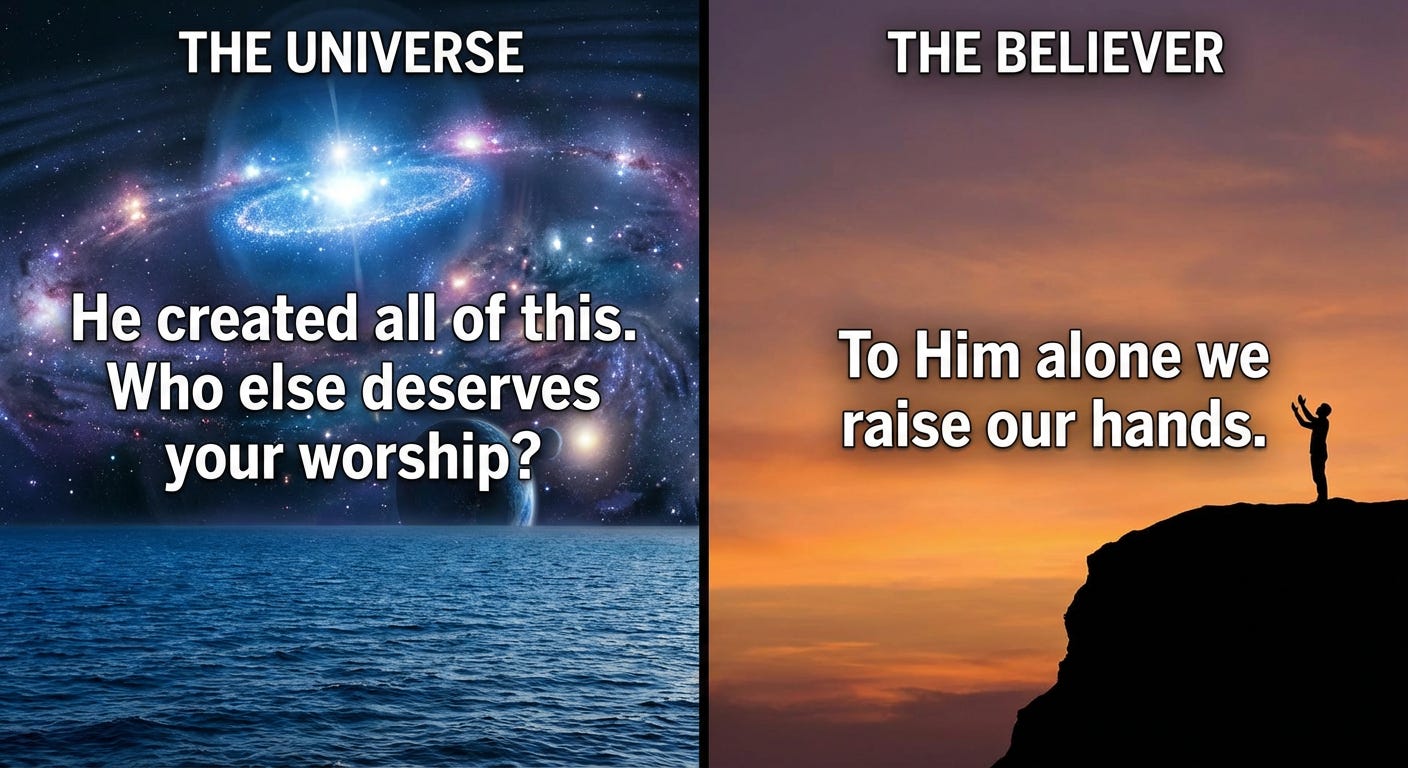 Here’s a way to think about it. The entire structure of Islam — prayer, fasting, Hajj, Zakat, morality, everything — rests on one single foundation: La ilaha illallah. There is no god but Allah.