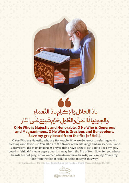 We appeal to the Owner of blessings, the Generous and Benevolent. The phrase “Save my grey beard” (shibah) is a metaphor for one’s physical being and dignity. Imam Khamenei clarifies that this is inclusive: for young people whose beards are not grey, or for women, the meaning is simply, “Save my face from the fire of Hell.” It is the most important prayer of all—preservation from spiritual ruin.